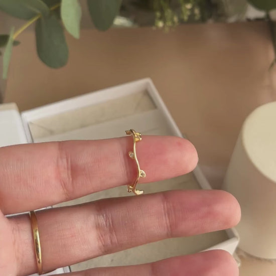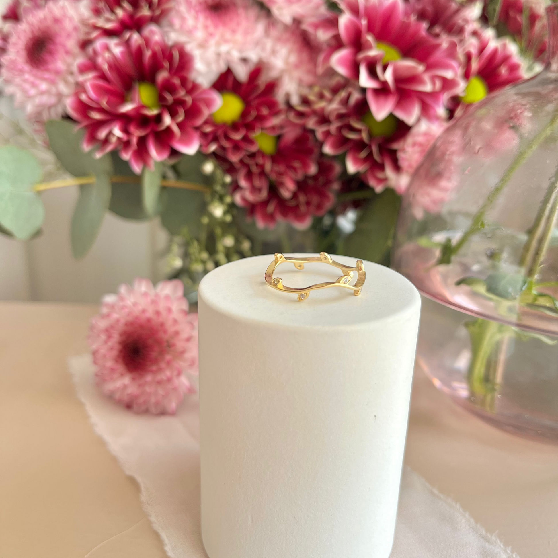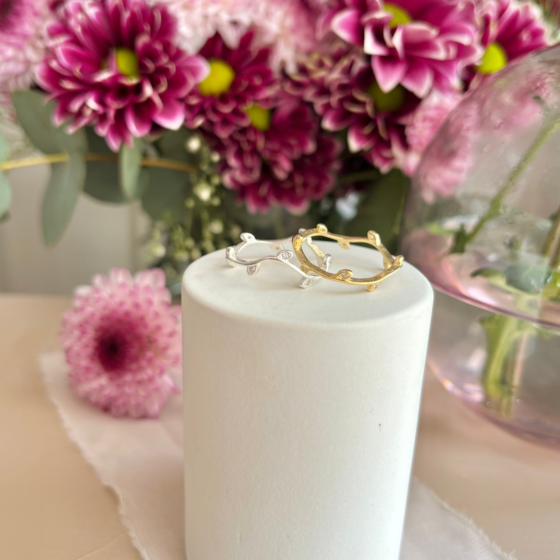 O Anel Nature tem formas orgânicas que remetem à natureza em seu estado mais puro: leve, fluida e viva. Cada detalhe lembra pequenas folhas que florescem pelo aro, criando uma peça que abraça o dedo. Perfeito para quem busca joias que celebrem o ritmo natural do tempo, dos afetos e do florescer.