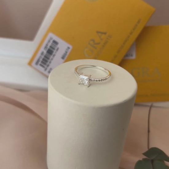 Um solitário clássico e sofisticado. O moissanite central de 5x5 mm em lapidação princesa é acompanhado por 14 moissanites de 1 mm no aro, criando um detalhe elegante e moderno. Todas as pedras têm classificação excelente em simetria, corte, polimento e coloração, além de certificado GRA. Uma peça marcante, perfeita para quem busca um solitário com presença.
