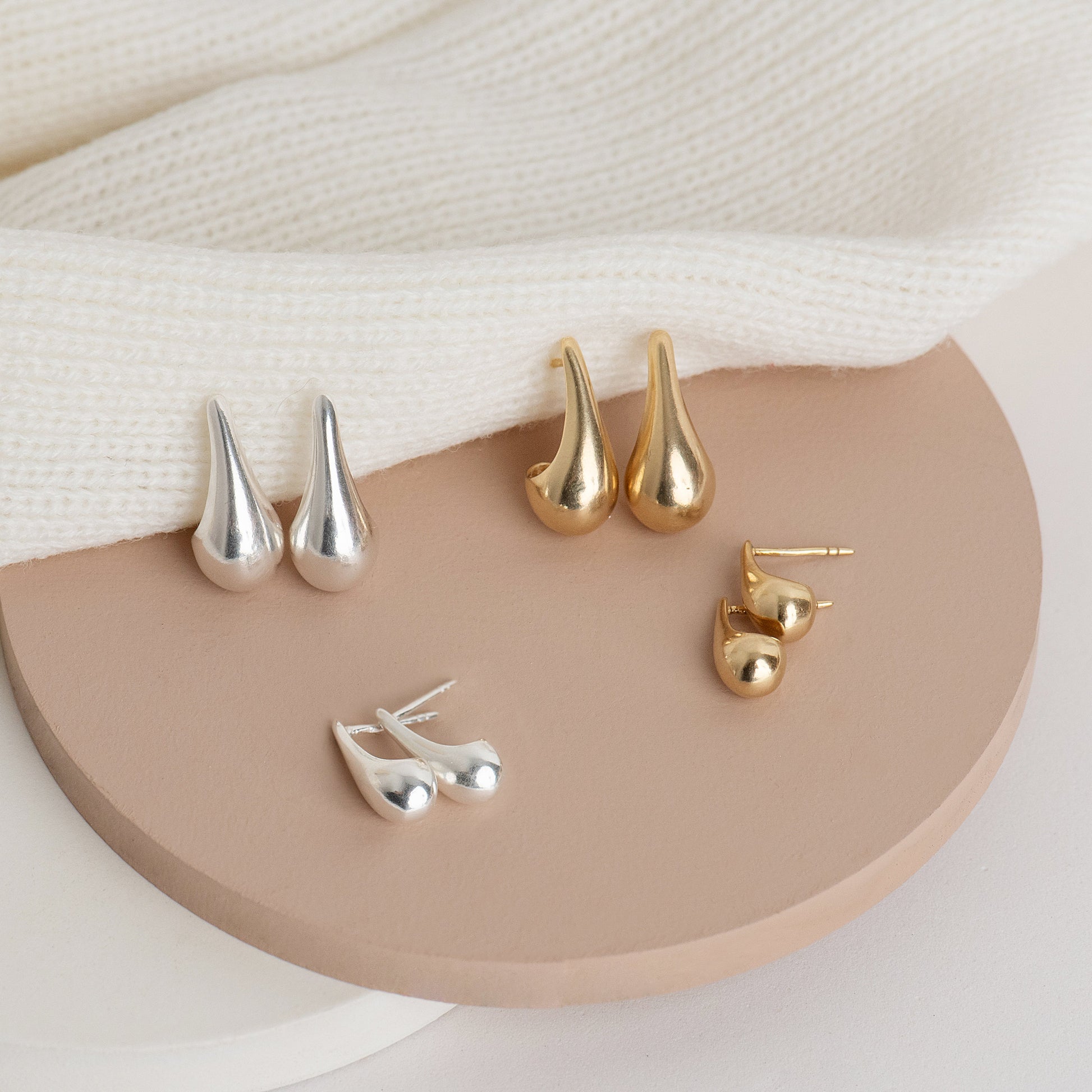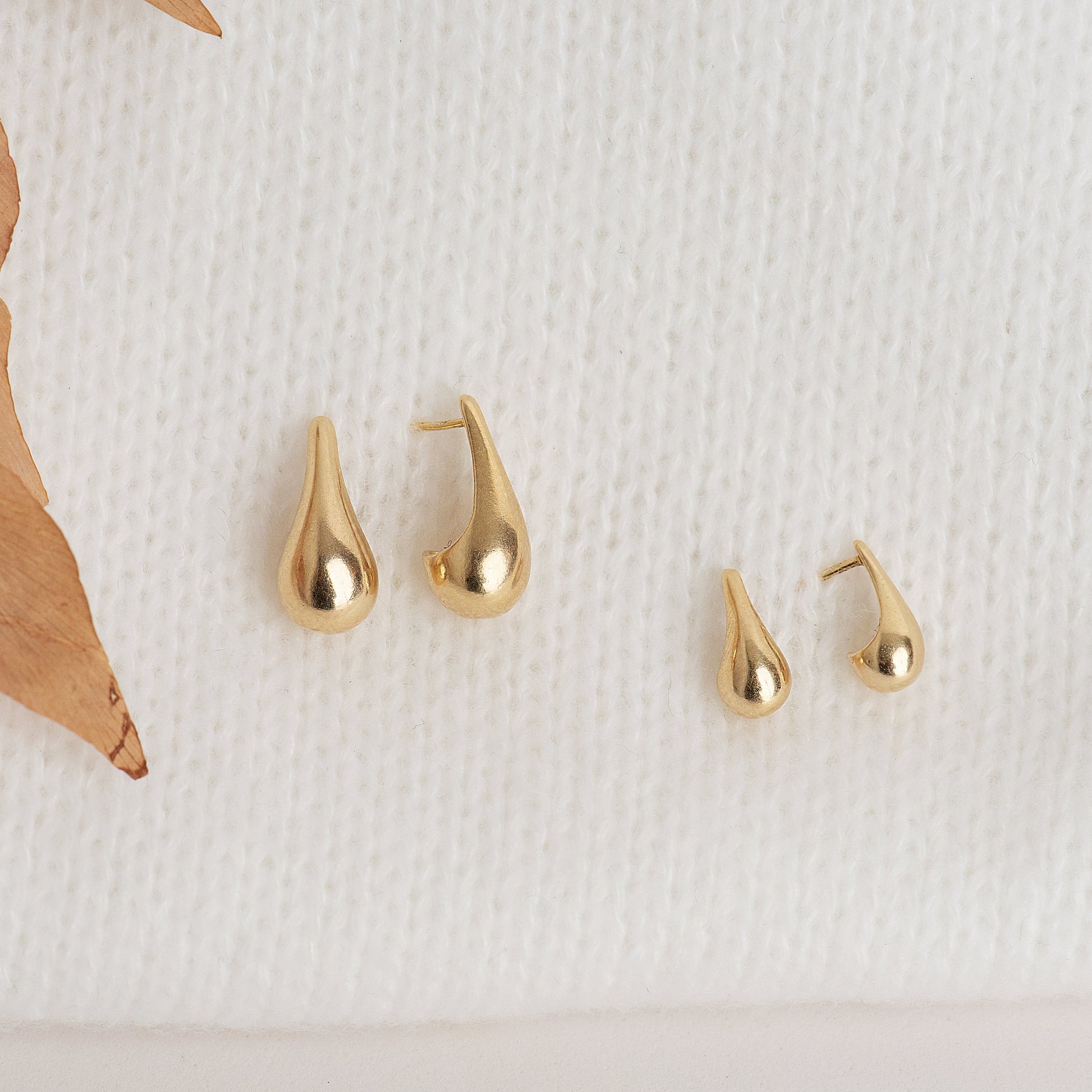 Com design orgânico inspirado na forma de uma gota, ele combina volume, leveza e sofisticação em uma peça versátil para o dia a dia. Fica lindo sozinho ou combinado com o menorzinho pra criar um duo cheio de charme. Possui acabamento polido e fecho de tarraxa tradicional para segurança e conforto ao usar.