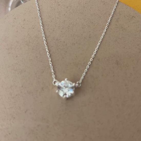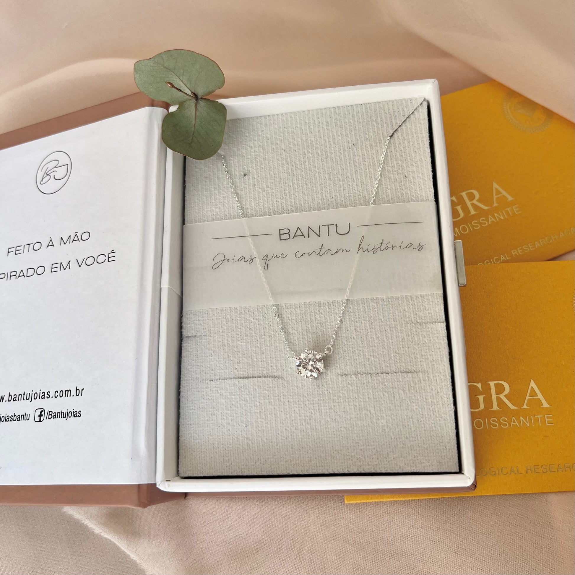 Um colar imponente, pensado para quem gosta de presença. O pingente traz um moissanite de 7 mm em lapidação tipo diamante, que se destaca com intensidade e sofisticação. A corrente delicada cria um contraste elegante, valorizando ainda mais a pedra. A joia conta com moissanite de classificação excelente em simetria, corte, polimento e coloração, além de certificado GRA.